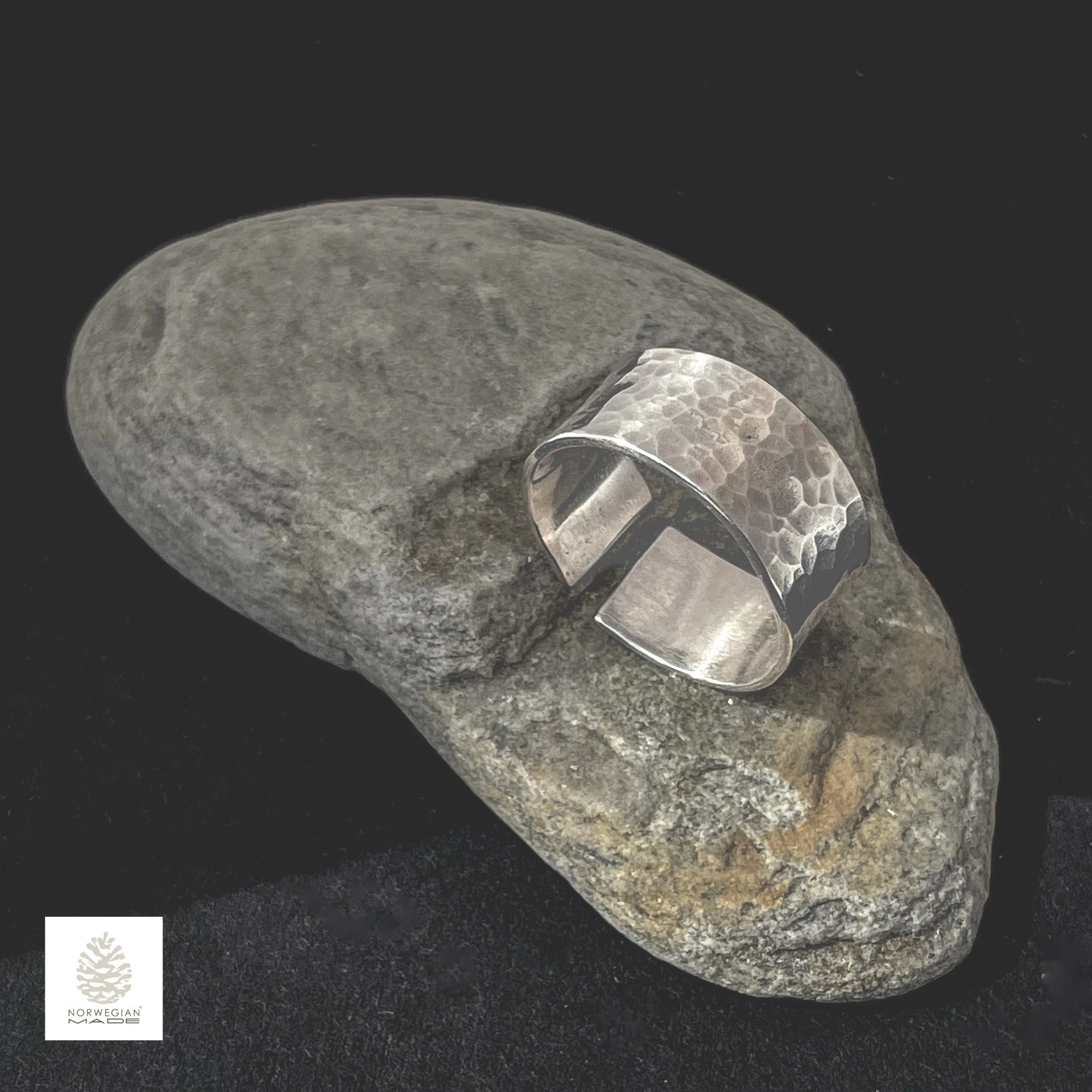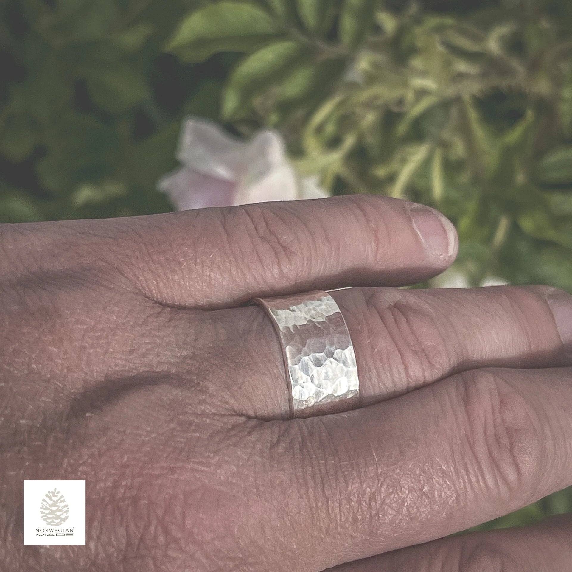 Denne ringen er laget for hånd i verkstedet vårt i Lofoten ved hjelp av tradisjonell hammerteknikk. Den håndhamrede overflaten gir et levende spill i lyset – moderne, tidløst og uttrykksfull.